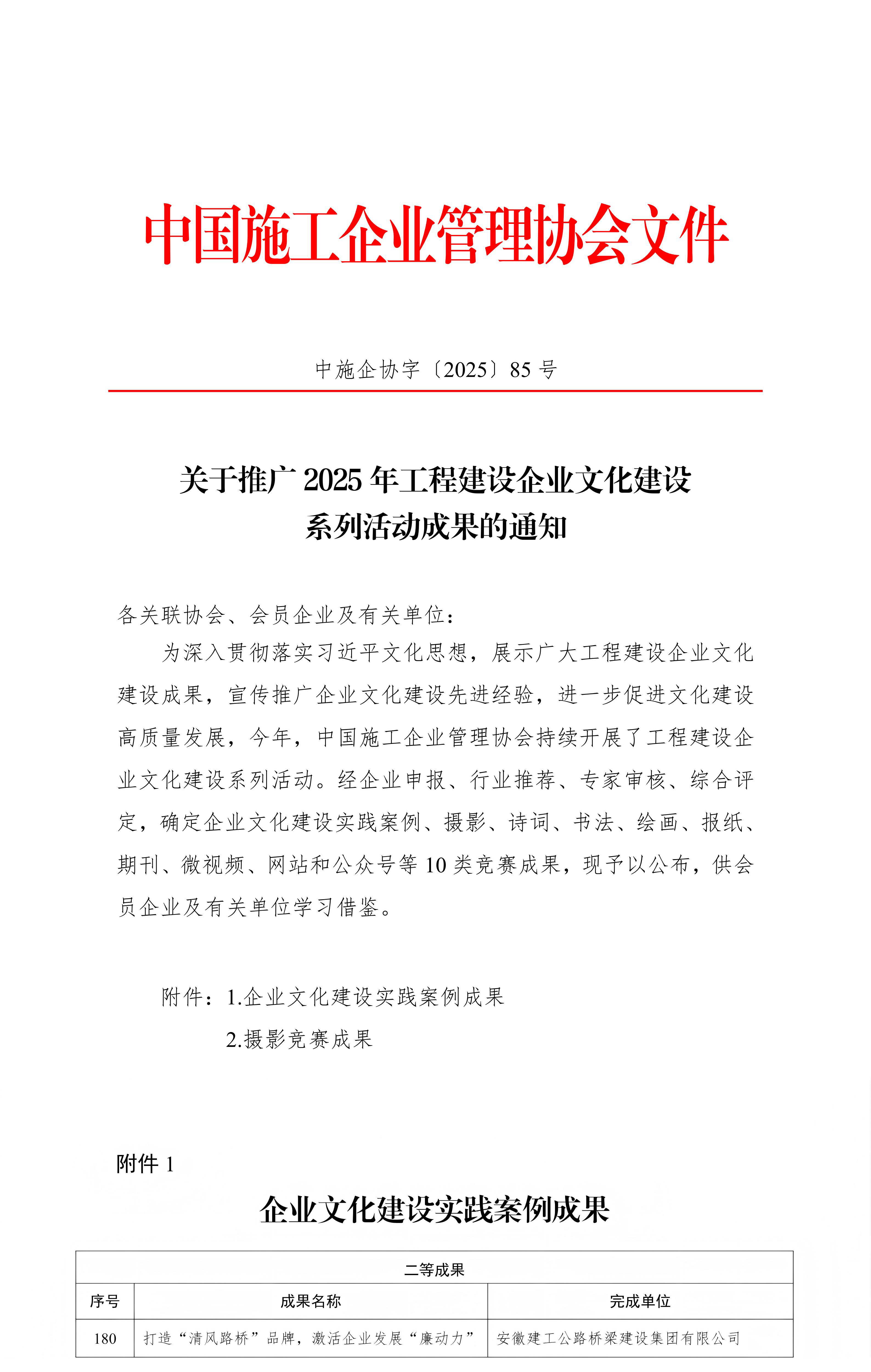 近日,中國施工企業(yè)管理協(xié)會公布了2025年工程建設(shè)企業(yè)文化建設(shè)實踐案例成果評選結(jié)果,公司《打造“清風(fēng)路橋”品牌,激活企業(yè)發(fā)展“廉動力”》從全國眾多申報案例中脫穎而出,榮獲企業(yè)文化建設(shè)實踐案例二等成果。這是繼上半年公司“清風(fēng)路橋”廉潔文化品牌獲評2025年工程建設(shè)企業(yè)黨建工作典型案例后,再次獲得中國施工企業(yè)管理協(xié)會表彰,充分展現(xiàn)了公司在廉潔文化建設(shè)領(lǐng)域的持續(xù)深化與品牌影響力。