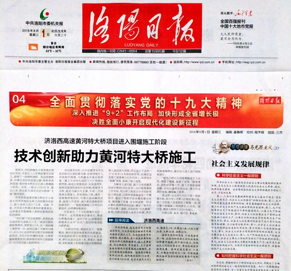 8月1日,《洛陽日報》04版刊發(fā)文章《技術(shù)創(chuàng)新助力黃河特大橋施工》,對公司黃河特大橋項目技術(shù)創(chuàng)新進行了報道。