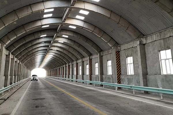 S201線路途徑瑪依塔斯風(fēng)區(qū),公司所承建的防風(fēng)雪試驗(yàn)工程在風(fēng)雪災(zāi)害最為嚴(yán)重的路段。該項(xiàng)目采用在路面上方建設(shè)一座仿造隧道式的棚洞,并用防雪網(wǎng)與擋雪板對棚洞的進(jìn)出口及風(fēng)吹雪嚴(yán)重路段進(jìn)行防護(hù),以防止吹雪在路面和棚洞洞口處堆積造成通行困難。棚洞主體采用鋼筋混凝土框架結(jié)構(gòu),能抵抗12級大風(fēng)。為了行車安全,還在棚洞內(nèi)部設(shè)置了波形梁護(hù)欄。該項(xiàng)目也是目前國內(nèi)首例采用棚洞工程進(jìn)行吹雪防治的嘗試,開辟了新疆地區(qū)科技創(chuàng)新成果與實(shí)際工程結(jié)合應(yīng)用的新篇章。