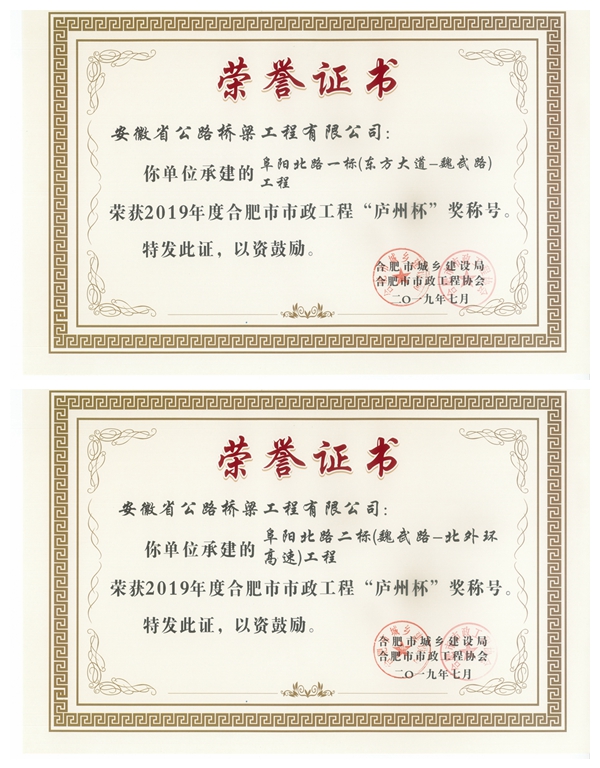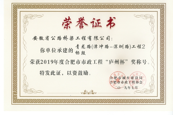 市政分公司三項目喜獲“廬州杯” 發布時間:2019年07月29日 來源:市政分公司 發布人: 作者:王東 瀏覽:3727次 近日從合肥市政工程協會獲悉,公司承建的阜陽北路一標、阜陽北路二標、青龍路二標等項目喜獲“廬州杯”。截至目前,市政分公司已累計獲得19個“廬州杯”獎項。