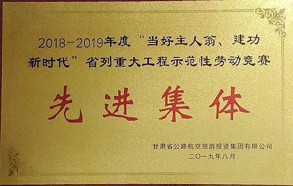 因在甘肅省公航旅集團開展的2018-2019年度“當好主人翁、建功新時代”省列重大工程示范性勞動競賽活動中表現優異,11月17日,銀百高速TY14標被授予“先進集體”稱號,項目負責人同時榮獲“優秀項目經理”稱號。
