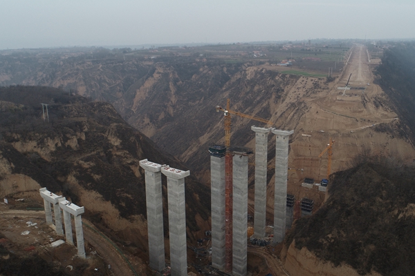 新城溝大橋作為項目控制性工程,長度不到400m的深溝內作業面狹小,附近便道又陡又窄,人員、機械、材料運輸困難,溝中的10個空心薄壁墩最高達到78米。為做到“又好又快”施工,技術人員經過調查和方案比選,采用翻模施工工藝與高墩自動噴淋養生技術,在保證工期的同時做到墩身外觀質量及實體強度滿足設計要求。過程中,大家克服數道難關,鉚足了勁與時間賽跑,提前完成橋梁下構施工任務,為后續架梁和橋面系施工贏得了有效時間。