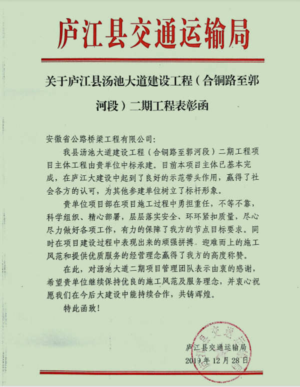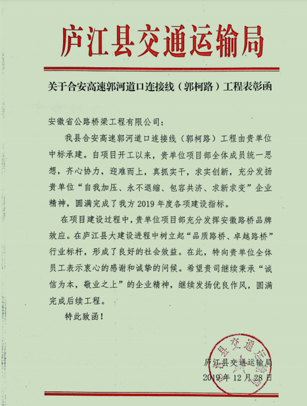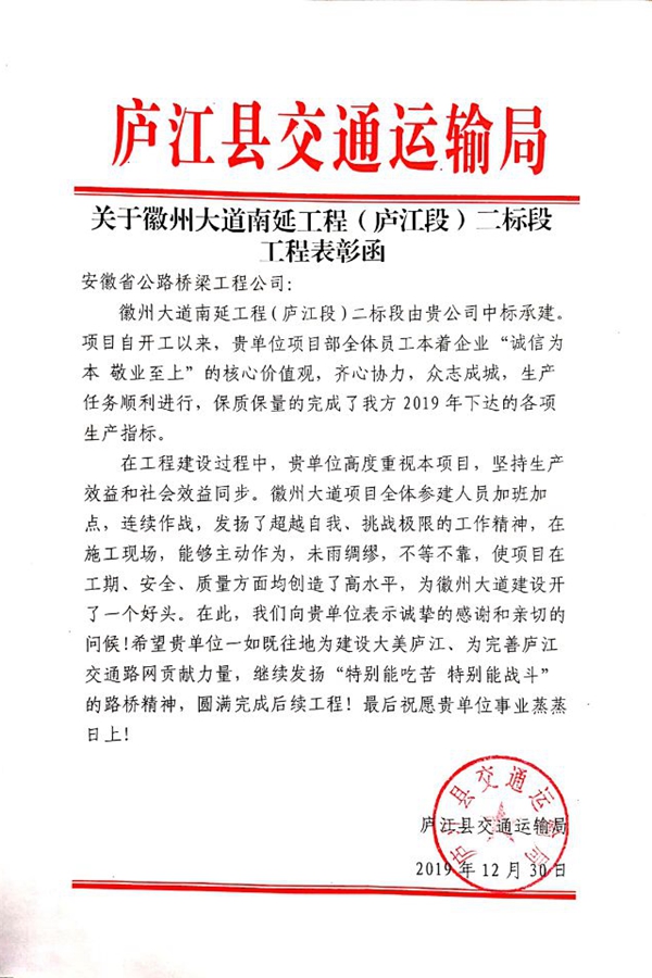 近日,公司收到廬江縣交通運輸局寄來的表揚信,對徽州大道南延工程(廬江段)二標段、湯池大道建設工程(合銅路至郭河段)二期及合安高速郭河道口連接線(郭柯路)工程等三個項目積極克服各類困難,高標準、嚴要求推進施工生產給予表揚和感謝。
