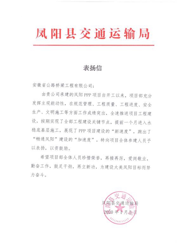 鳳陽(yáng)PPP項(xiàng)目獲縣交通運(yùn)輸局表?yè)P(yáng)