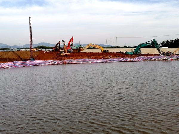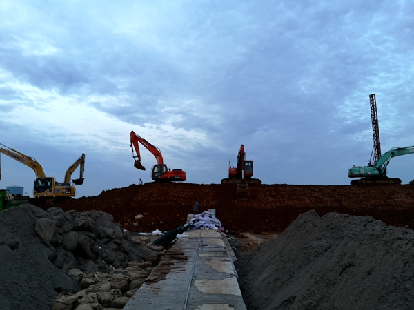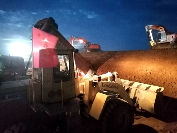 巢湖市東外壞旗山撇洪溝,位于巢湖鼓山腳下,連接清溪河支流,連日降雨,清溪河水位暴漲,防汛壓力巨大,經開區的人民生命和財產安全受到嚴重威脅。經巢湖市政府研究決定,在旗山撇洪溝和清溪河支流交匯處筑壩,將撇洪溝東側低洼處作為清溪河支流泄洪預備區,以應對清溪河水位暴漲危險。接到汛情指令,巢湖市亞父路項目部迅速出動,組建防汛突擊隊,調集挖掘機、裝載機等機械設備迅速奔赴搶險一線,連續奮戰兩天三夜,填筑黃土近10000方,碎石1500方,拋石700噸,圓滿完成了底寬22米,上寬10米,高5米,長110米的筑壩任務,確保了經開區的人民生命和財產安全。