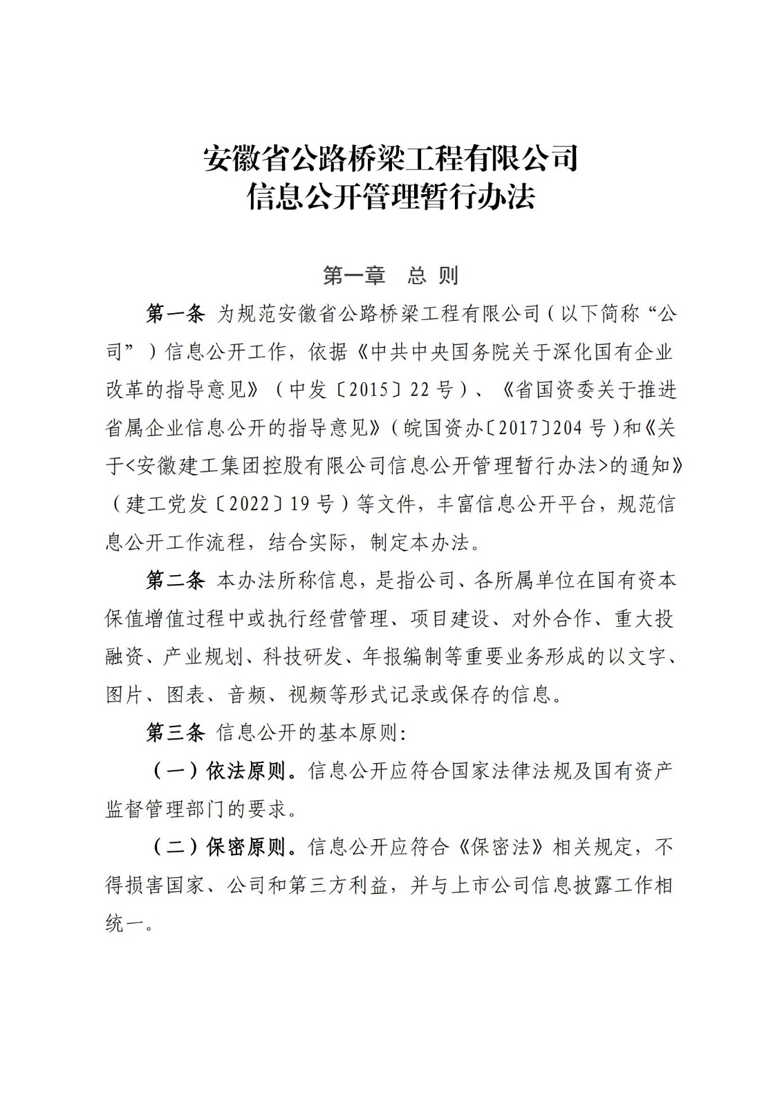 安徽建工公路橋梁建設(shè)集團(tuán)有限公司信息公開暫行管理辦法 發(fā)布時(shí)間:2022年11月20日 來源:安徽路橋公司 發(fā)布人:黨委工作部 作者:安徽路橋公司 瀏覽:9130次
