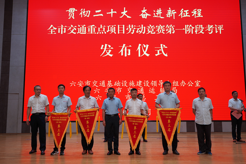 7月15日,在六安市交通運輸基礎設施領導小組辦公室、市交通運輸局、市總工會聯合舉行的“貫徹二十大 奮進新征程”全市交通重點項目勞動競賽第一階段考評發布儀式上,公司承建的六安G237一期項目榮獲國省干線公路項目第一名、霍邱縣彭塔至潘集段建設工程榮獲第三名。