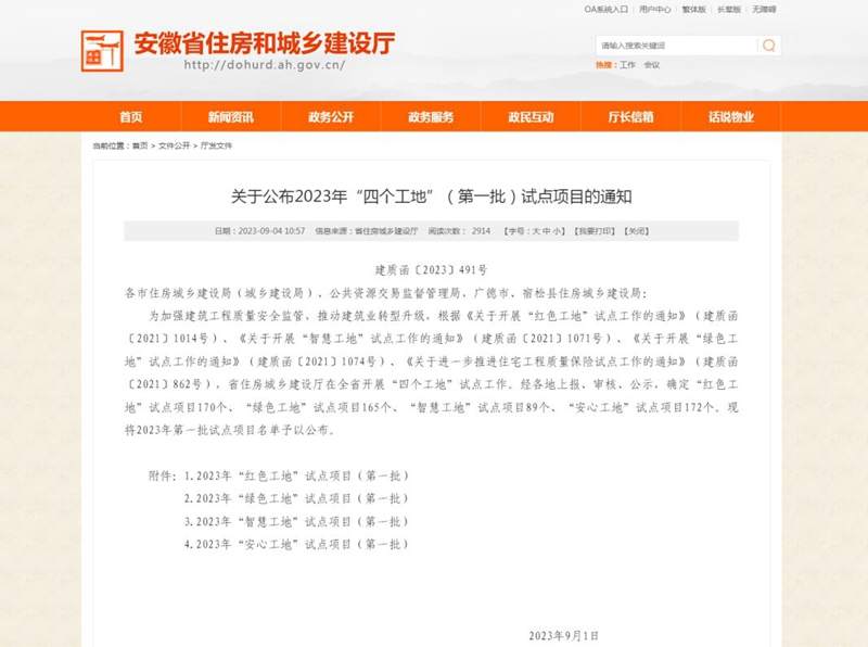 近日,安徽省住房和城鄉(xiāng)建設廳公布了2023年“四個工地”(第一批)試點項目名單,公司承建的多個項目在全省“四個工地”評比活動中脫穎而出,其中獲評“安心工地”項目3個,“紅色工地”項目4個,“綠色工地”項目4個,“智慧工地”項目1個。