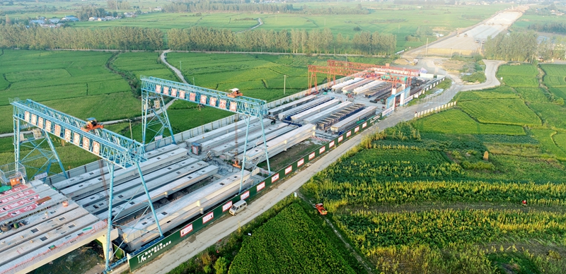 作為項目建設的“重頭戲”,三個預制梁場建設與1000余片箱梁的預制和架設是保障項目工期的重要環節。受到土地政策和路基施工工期因素影響,項目西岸梁場原場地建設方案受到很大制約。為此,項目負責人帶領技術人員頂著酷暑,找場地、拿方案,將原定于路基段建設的兩個梁場改為橋梁區建設,并及時安排人員跟蹤土地丈量及臨時用地相關事宜。在梁場建設過程中,努力克服場地施工交替頻繁、高溫雨水、道路運輸條件較差等多項難題,在6月實現首片箱梁澆筑;7月西岸預制梁場建設基本完成;8月首跨箱梁架設完成;9月3個梁場均達到滿產。勞動競賽沖鋒號吹響以來,項目牢固樹立“一切圍繞項目轉、一切聚焦項目干”的工作理念,確保日日有重點、周周有變化、月月有成效。目前樁基、墩柱、箱梁預制架設施工進度始終保持全線領先優勢。