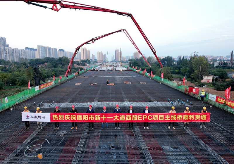 中秋、國慶“雙節”期間,在信陽市新十一大道項目施工現場,數百名工人和幾十臺大型機械正在緊張有序地進行鋼筋綁扎、梁板澆筑等施工作業,項目全體建設者不畏艱難、頑強拼搏,用激情和汗水詮釋責任和擔當,用專業和實干詮釋“路橋皖軍”品牌。