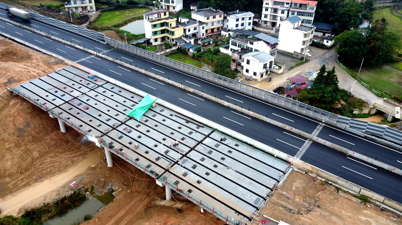 此次架設的崗尾中橋為舊橋拆除重建,施工方案為兩側加寬,共4跨,共需預制梁板28片。自“百日攻堅大會戰”專項競賽啟動以來,項目錨定通車目標,聚焦重點工序,搶抓晴好天氣,實行24小時輪班作業制,持續掀起施工熱潮。截至目前,項目路基、涵洞、橋梁及隧道工程已全部完成,路面工程完成99%。