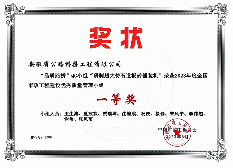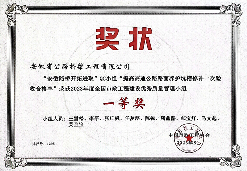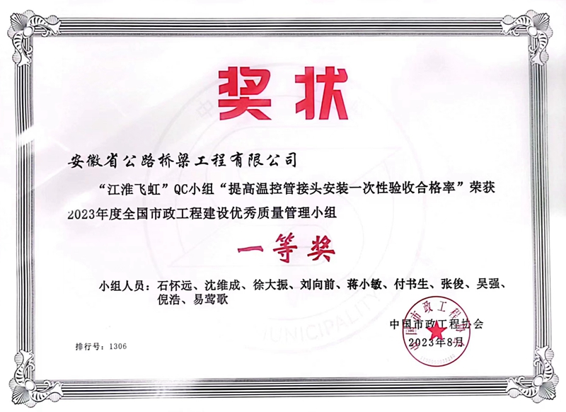 11月10日,中國市政工程協會“2023年全國市政工程建設質量管理小組培訓交流會”在廣東佛山順利召開,會上頒發了2023年度全國市政工程建設優秀質量管理小組各分組成績排名第一的QC成果證書,公司3項成果名列其中。