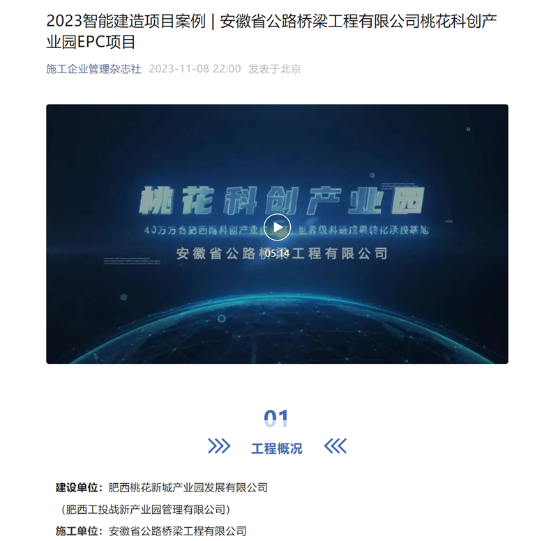 近日,從施工企業管理雜志社傳來喜訊,桃花科創產業園項目入選施工企業管理雜志社2023智能建造項目案例,同步對案例進行了專題介紹。