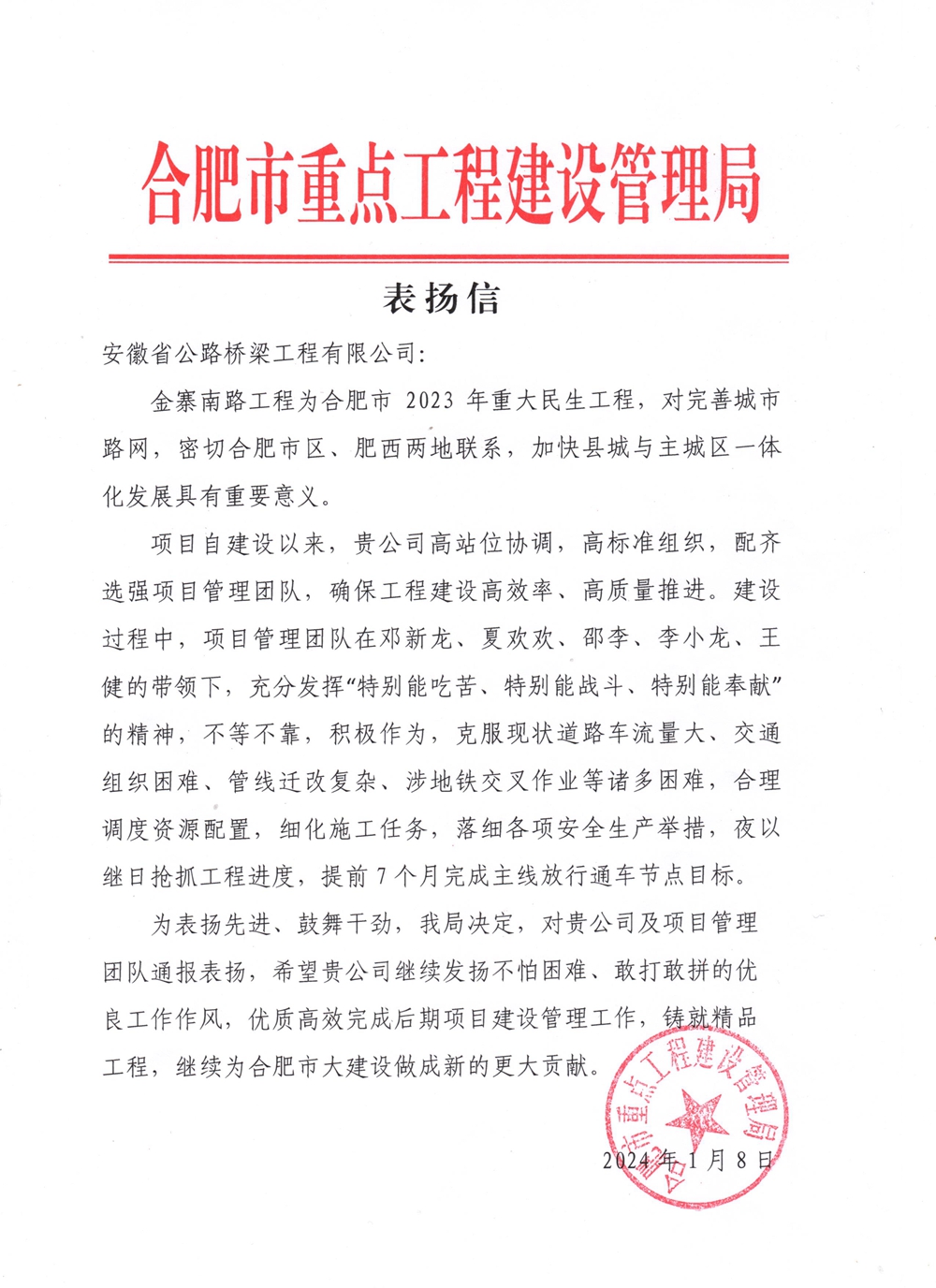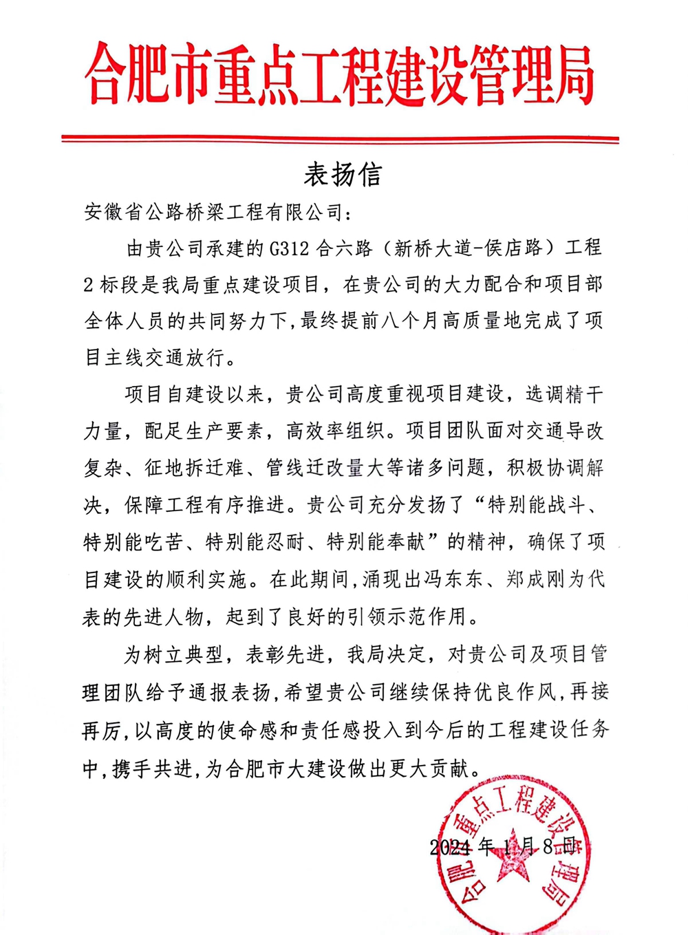【載譽再出發(fā)】公司多個市政重點項目榮獲表彰(三) 發(fā)布時間:2024年01月09日 來源:市政分公司 發(fā)布人:黨委工作部 作者:周健 瀏覽:2815次 近日,公司承建的G312合六路(新橋大道-侯店路)工程2標(biāo)、金寨南路快速化改造(望水路-站前路)項目、金寨南路快速化改造工程(站前路—深圳路)1標(biāo)項目收到合肥市重點局來信表揚。 來信指出,G312合六路(新橋大道-侯店路)工程2標(biāo)等3個項目在建設(shè)過程中,高站位協(xié)調(diào),高標(biāo)準(zhǔn)組織,配齊選強項目管理團隊,確保工程建設(shè)高效率、高質(zhì)量推進,圓滿完成了主線通車任務(wù)。同時對項目建設(shè)過程中涌現(xiàn)出的馮東東、鄧新龍、夏歡歡、鄭成剛、邵李、李小龍、王健等先進人物進行了表揚。
