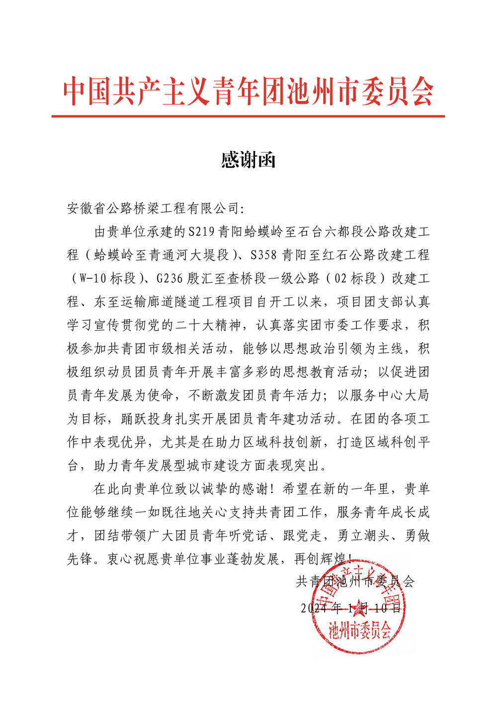 1月10日,公司收到共青團池州市委感謝函,對S219青陽蛤蟆嶺至青通河大堤段改建等4個項目堅持黨建帶團建,服務生產經營工作,尤其是助力打造區域科創平臺,助力青年發展型城市建設方面的突出貢獻給予感謝。