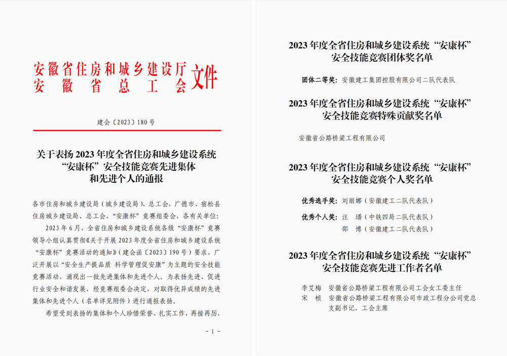 近日,安徽省總工會、住房城鄉(xiāng)建設廳聯(lián)合發(fā)布《關(guān)于表揚2023年度全省住房和城鄉(xiāng)建設系統(tǒng)“安康杯”安全技能競賽先進集體和先進個人的通報》,公司榮獲競賽特殊貢獻獎,以公司選手為主力的安徽建工二隊獲得競賽團體二等獎。公司職工宋楨、李艾梅獲競賽“先進工作者”,公司選手劉麗娜、邵博分獲競賽“優(yōu)秀選手獎”“優(yōu)秀個人獎”。
