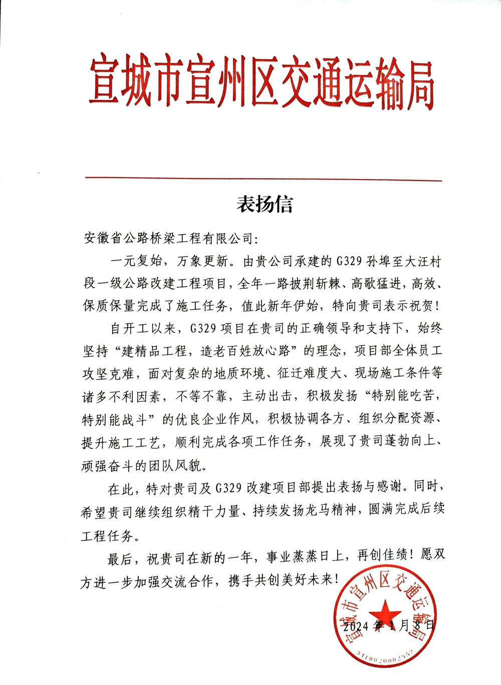 宣城市宣州區交通運輸局來信指出,G329孫埠至大汪村段一級公路改建工程項目始終堅持“建精品工程,造百姓放心路”的理念,克服地質環境復雜、征遷難度大、施工條件差等諸多不利因素,積極協調各方,順利完成各項工作任務,展現了項目團隊頑強奮斗的精神風貌。