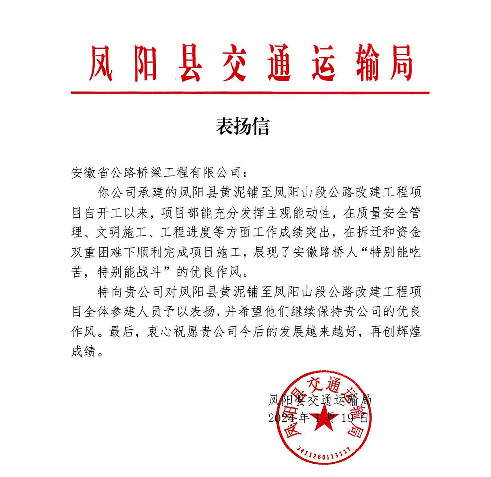 鳳陽縣交通運輸局來信表示,鳳臺縣黃鳳公路改建工程項目團隊發揮主觀能動性,在質量安全管理、文明施工、工程進度等方面工作成績突出,充分發揚了安徽路橋“特別能吃苦、特別能戰斗”的企業作風。