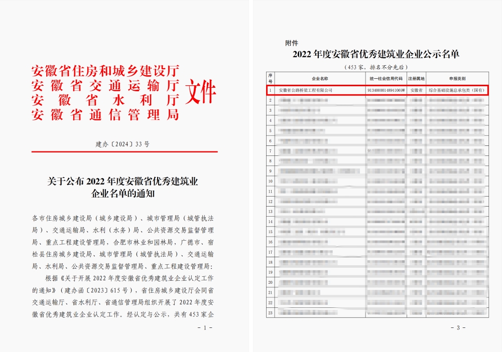 近日,安徽省住房和城鄉建設廳、安徽省交通運輸廳、安徽省水利廳、安徽省通信管理局聯合公布了“2022年度安徽省優秀建筑業企業”名單,公司連續三年以綜合基礎設施總承包類別成功入選。