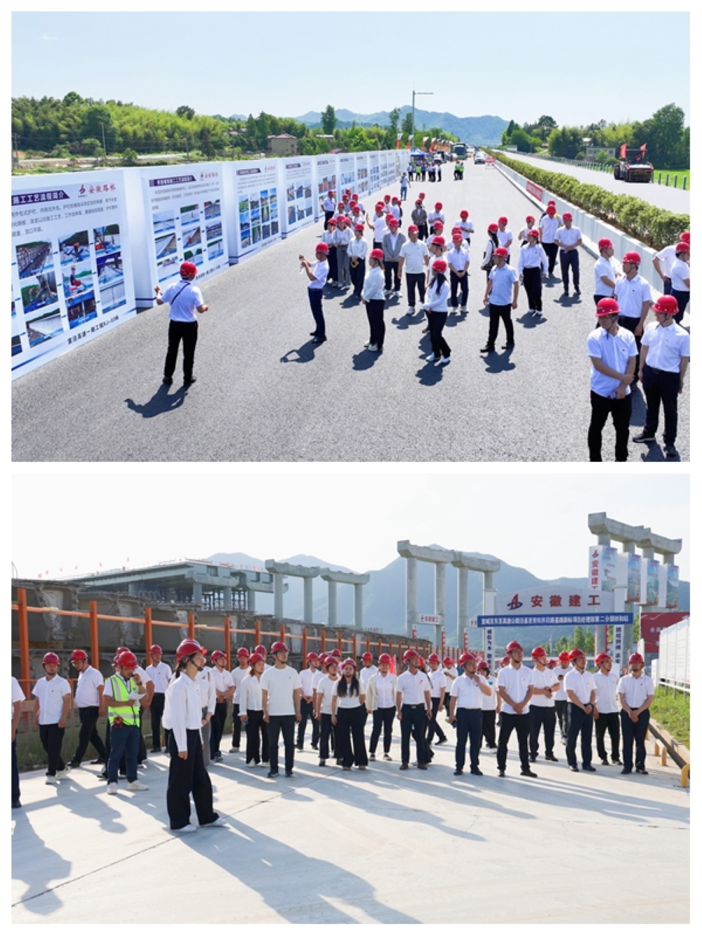 在安徽路橋宣涇高速一期03標(biāo)項目,青年們參觀了項目駐地及黨群活動場所,在施工現(xiàn)場觀摩了解了瀝青無人攤壓技術(shù)和新澤西護(hù)欄預(yù)制安裝等施工工藝。在安徽水利涇青高速二分部,青年們先后參觀了青弋江特大橋安全文明施工以及場站和安全體驗館標(biāo)準(zhǔn)化建設(shè)情況。