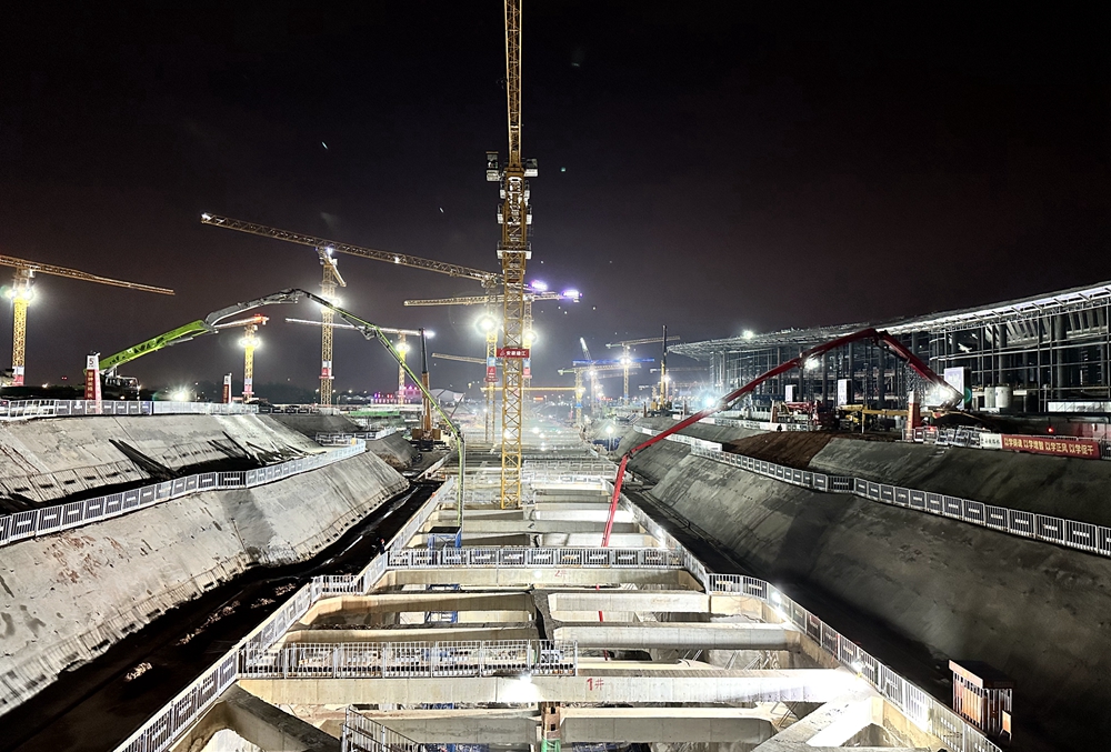 6月18日,合肥新橋國際機場綜合交通中心項目經過一晚上的鏖戰,成功完成合新六城際鐵路新橋機場站先行工程首塊軌頂風道澆筑施工。