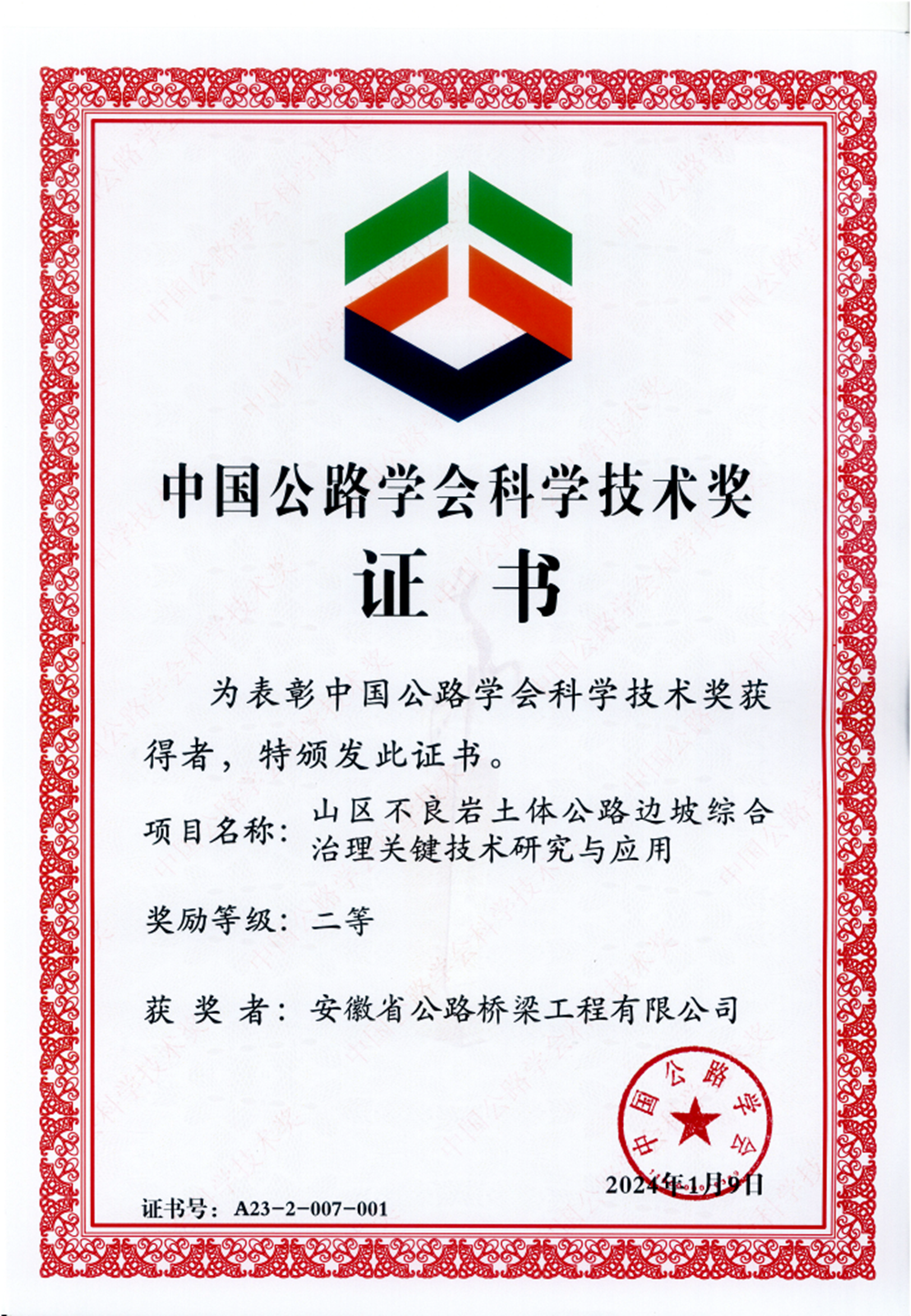 公司榮獲2023年度中國公路學會科學技術二等獎