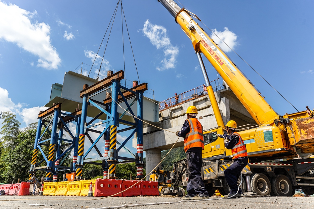 首件鋼箱梁長11.4米,跨G205國道,涉路施工壓力較大。施工過程中,項目積極對接當地交警等部門,做好交通導改,有效保障了鋼箱梁安全架設。