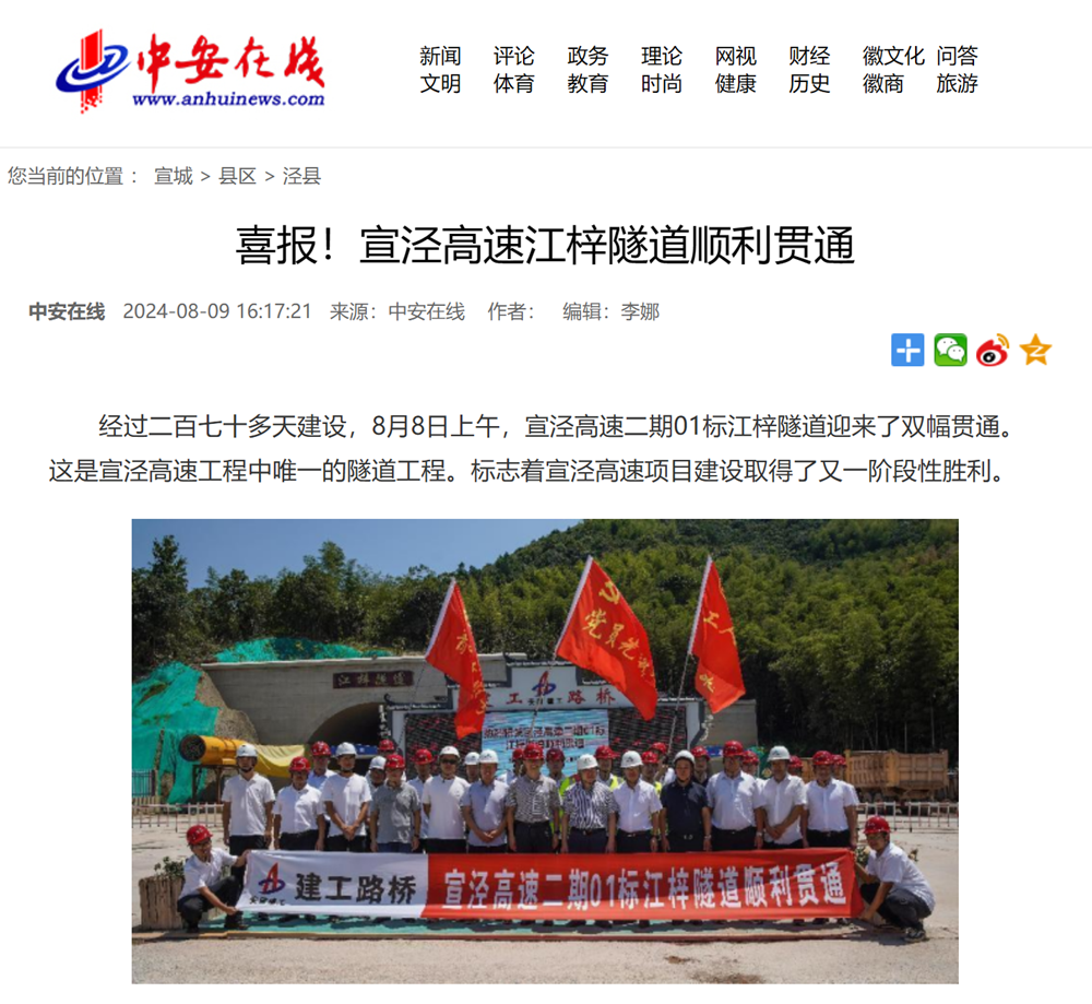 【名媒聚焦】央廣網(wǎng)、中安在線、宣城發(fā)布:宣涇高速二期01標江梓隧道順利貫通