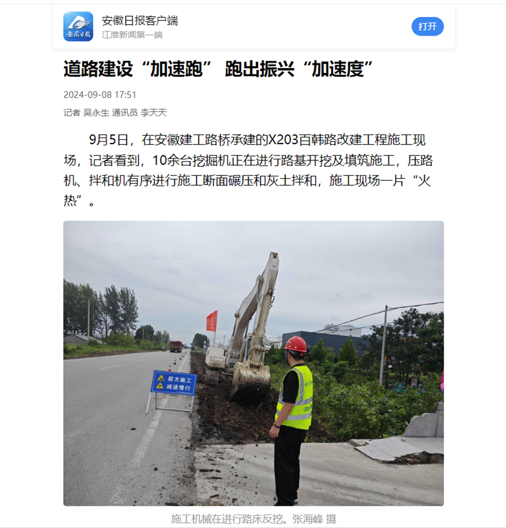 【名媒聚焦】安徽日?qǐng)?bào)客戶(hù)端:X203百韓路改建工程——道路建設(shè)“加速跑” 跑出振興“加速度”
