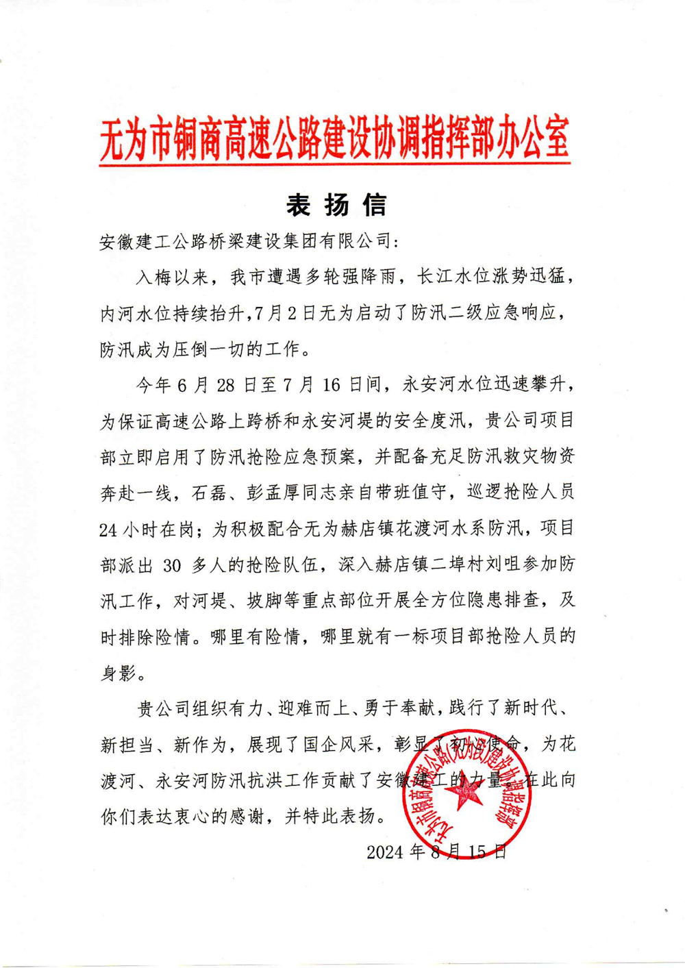無為市銅商高速公路(無為段)建設協調指揮部對公司承建的銅商高速主體1標項目部進行表揚。來信指出,汛期期間,項目部及時啟動防汛搶險應急預案,配足物資奔赴一線,迎難而上,安排人員24小時巡邏,開展全方位隱患排查,為防汛抗洪工作作出了突出貢獻,展現了國企擔當。