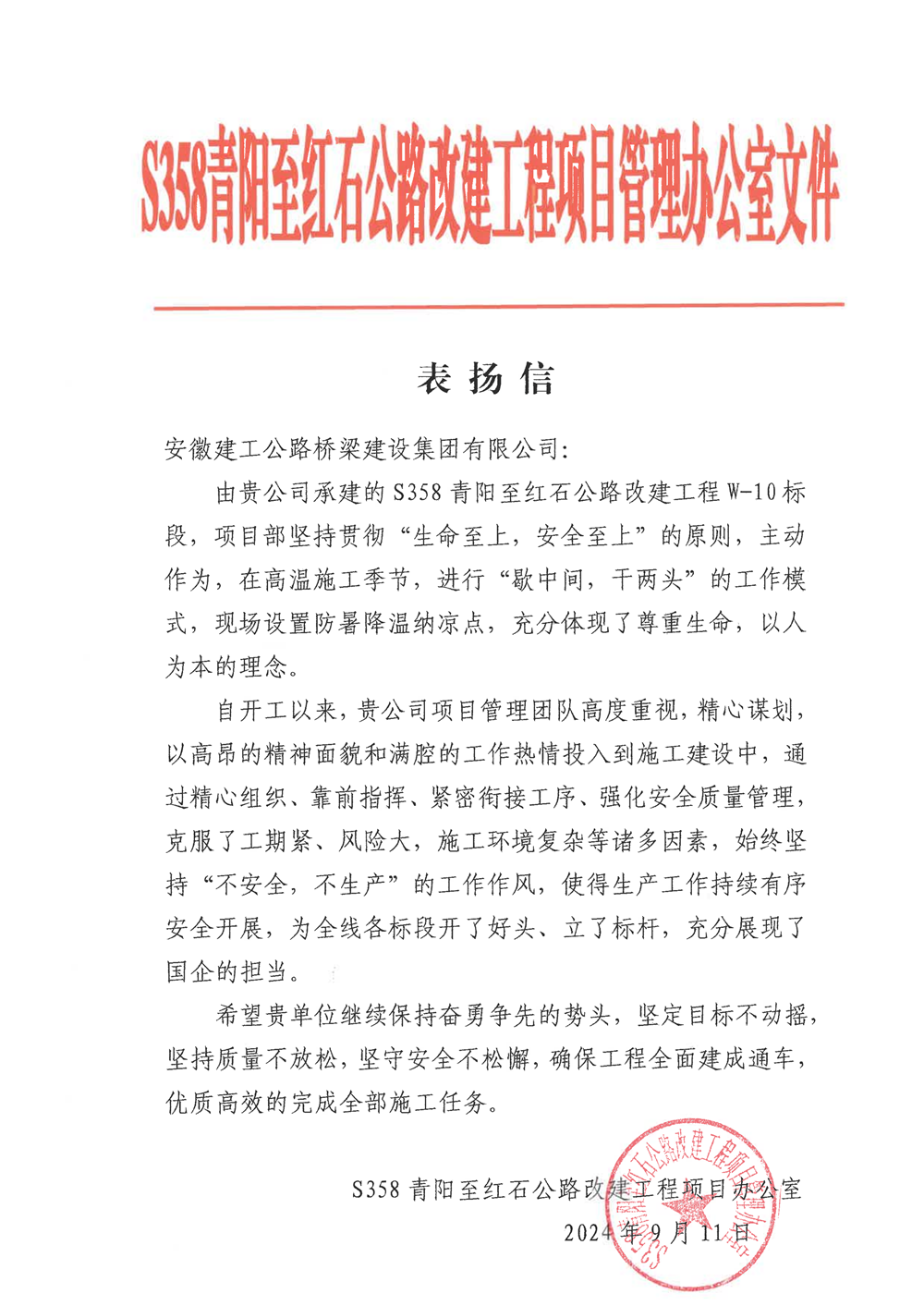 S358青陽至紅石公路改建工程項目辦公室來信指出,公司承建的W10標在高溫施工季節,堅持貫徹“生命至上,安全至上”的原則、“不安全,不生產”的工作作風,落實防暑降溫措施和安全生產各項要求,體現了“以人為本”的理念。