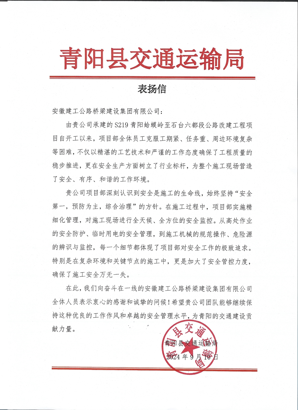 青陽縣交通運輸局來信表示,青陽S219改建項目自開工以來,不斷克服工期緊、任務重、周邊環境復雜等困難,始終堅持“安全第一,預防為主,綜合治理”的方針,安全穩步推動項目建設,在安全生產方面樹立了標桿。