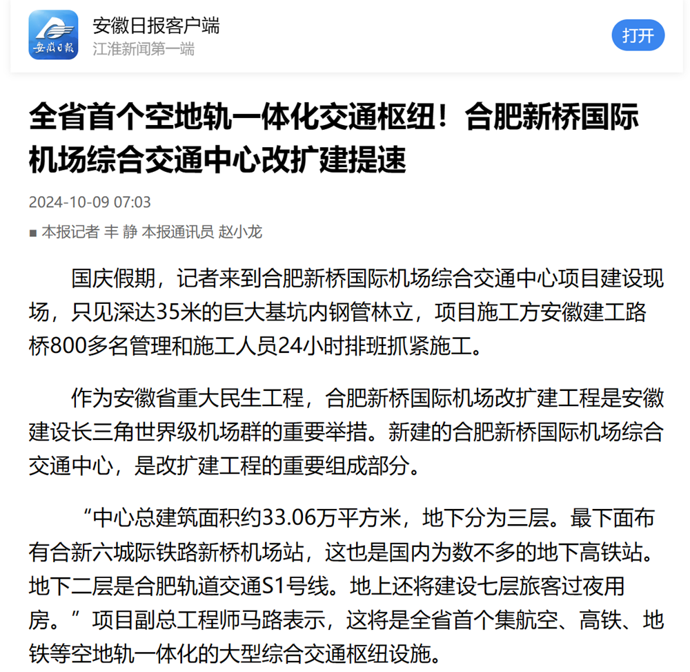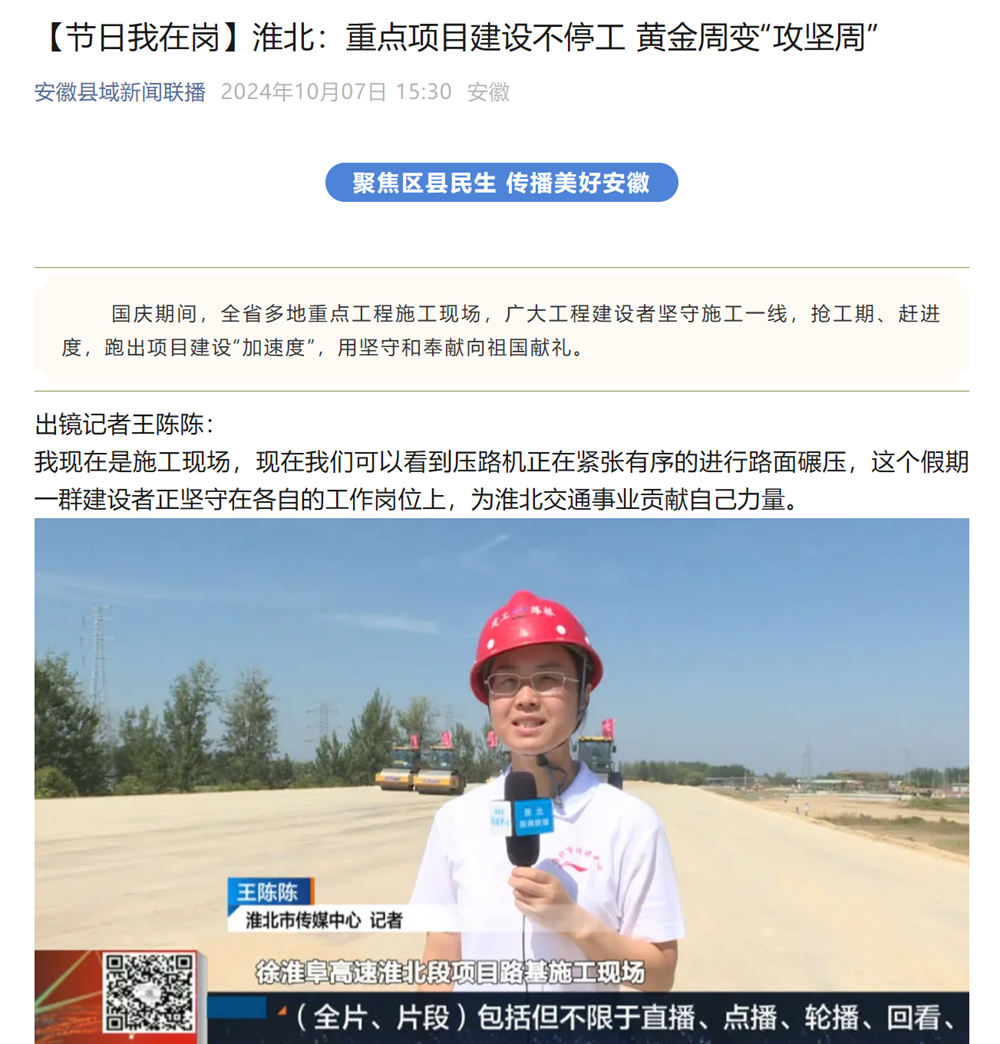 國慶前后,安徽新聞聯(lián)播、安徽日報、江淮晨報等多家省級主流媒體紛紛聚焦公司承建的涇青高速04標、徐淮阜高速淮北段、合肥新橋國際機場綜合交通中心等重點項目建設(shè)情況進行報道。