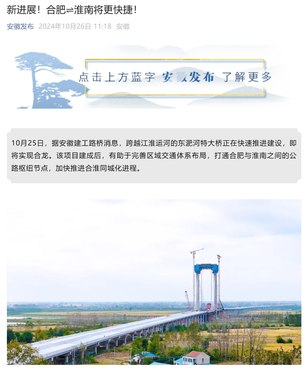【名媒聚焦】安徽發布、合肥日報、淮河早報等主流媒體持續聚焦東淝河特大橋建設