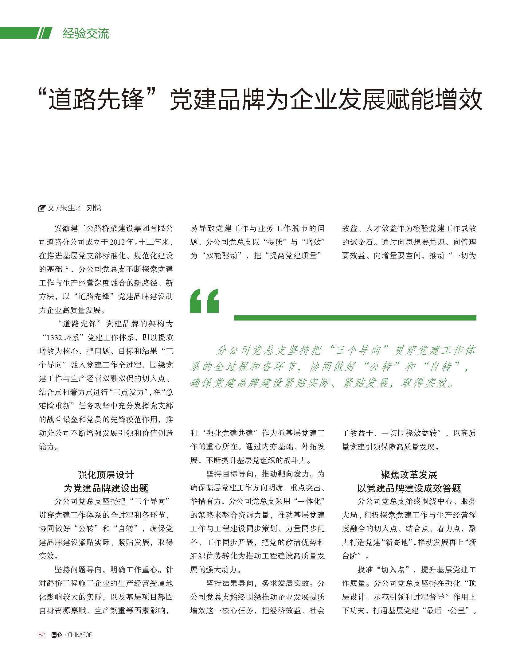 近日,《國企》雜志2024年10月第20期和《國企黨建研究》微信公眾號刊發文章《“道路先鋒”黨建品牌為企業發展賦能增效》,對安徽建工路橋道路分公司“道路先鋒”黨建品牌創建經驗進行了報道。