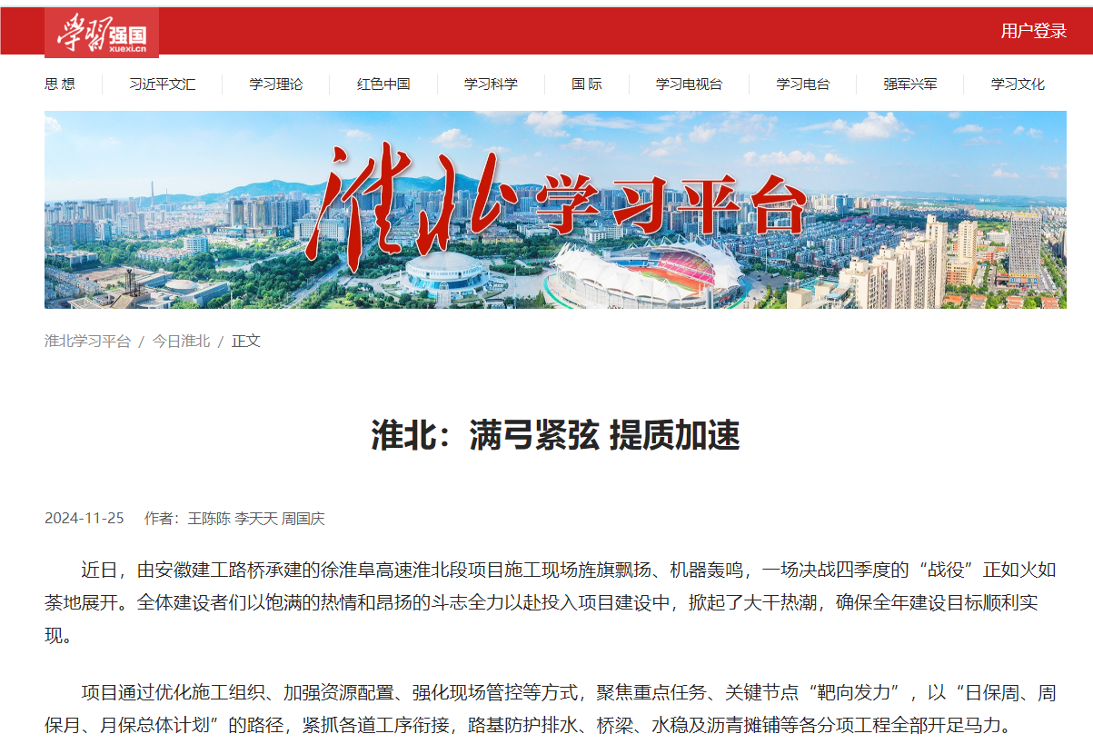 【名媒聚焦】安徽日?qǐng)?bào)客戶(hù)端、學(xué)習(xí)強(qiáng)國(guó)、淮北日?qǐng)?bào):決戰(zhàn)年終!徐淮阜高速建設(shè)加速?zèng)_刺