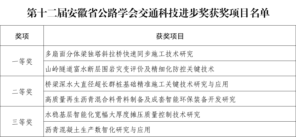 近日,安徽省公路學會八屆三次理事會在宣城召開,會上表彰了第十二屆安徽交通科技進步獎獲獎項目及2024年度先進單位。公司申報的6項科研項目成果分別榮獲一、二、三等獎,公司榮獲2024年度先進會員單位。