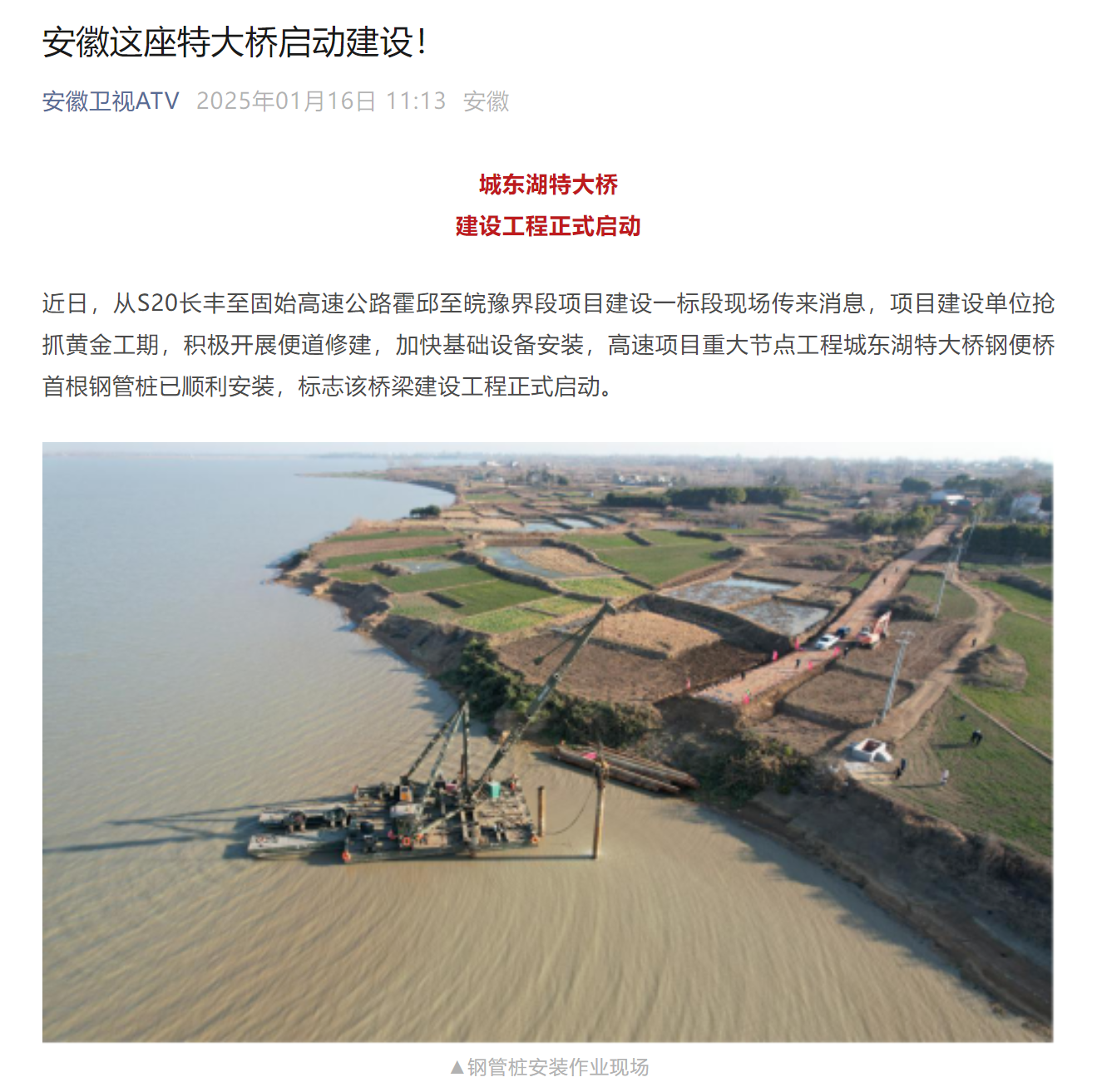 近日,從S20長豐至固始高速公路霍邱至皖豫界段項目建設一標段現場傳來消息,項目建設單位搶抓黃金工期,積極開展便道修建,加快基礎設備安裝,高速項目重大節點工程城東湖特大橋鋼便橋首根鋼管樁已順利安裝,標志該橋梁建設工程正式啟動。