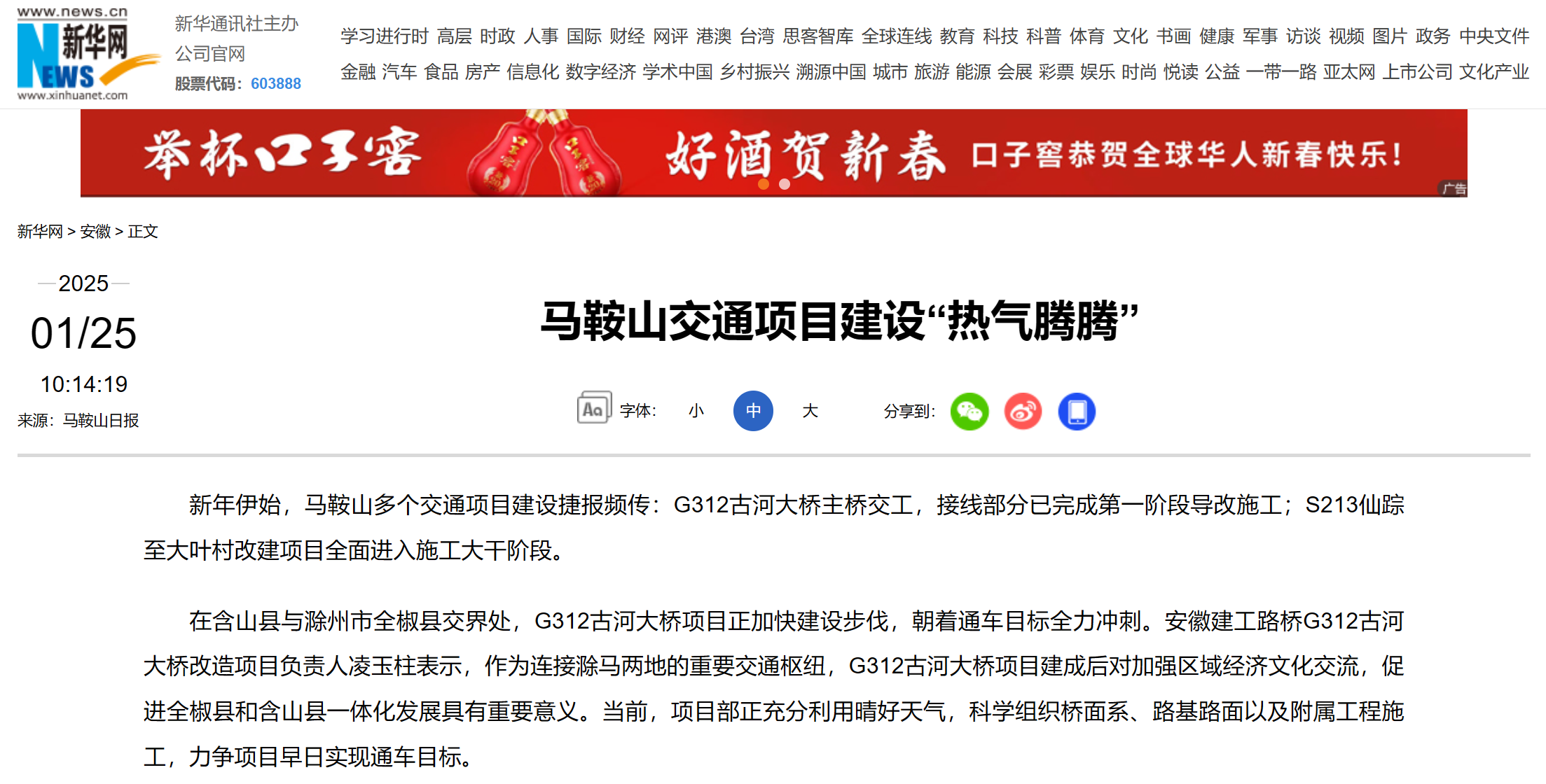 新年伊始,馬鞍山多個交通項目建設(shè)捷報頻傳:G312古河大橋主橋交工,接線部分已完成第一階段導(dǎo)改施工;S213仙蹤至大葉村改建項目全面進(jìn)入施工大干階段。
