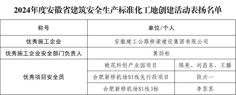 近日,安徽省建設工程與質量安全協會發布表揚通知,公司榮獲“2024年度安徽省建筑安全生產標準化工地優秀施工企業”稱號,公司安全環保部黃勁松同志榮獲“2024年度安徽省建筑安全生產標準化工地優秀施工企業安全部門負責人”稱號,桃花科創產業園項目、合肥新橋機場S1線先行段項目、S1線3標等3個項目安全管理人員榮獲“優秀項目安全員”稱號。
