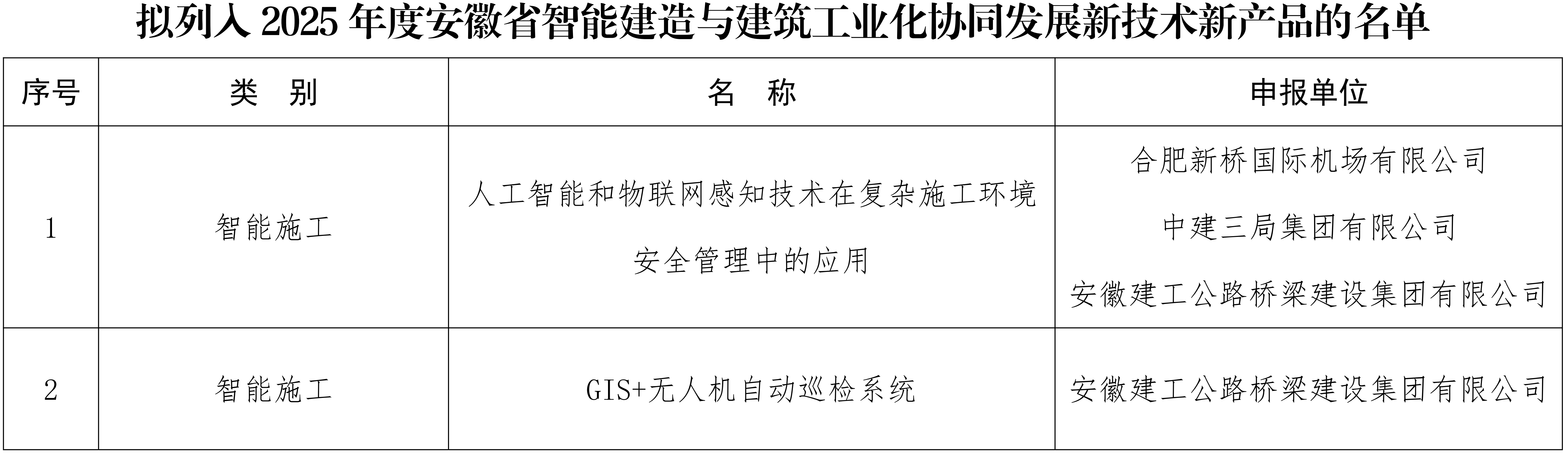 近日,安徽省住房和城鄉建設廳公布了2025年度安徽省智能建造與建筑工業化協同發展新技術新產品及試點項目,公司“新橋機場S1線土建施工總承包3標”、“新橋機場S1線合肥西站樞紐先行段”、“合肥新橋國際機場綜合交通中心(含軌道引入)及配套工程”三個項目,“人工智能和物聯網感知技術在復雜施工環境安全管理中的應用”、“GIS+無人機自動巡檢系統”等兩項產品應用成功入選。