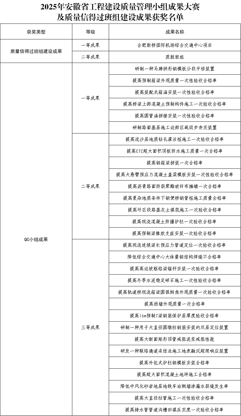 近日,安徽省建設(shè)工程質(zhì)量與安全協(xié)會公布了2025年安徽省工程建設(shè)質(zhì)量管理小組成果大賽及質(zhì)量信得過班組建設(shè)成果獲獎名單,公司申報(bào)的30個QC成果及2個班組成果榮獲佳績,其中獲得QC成果一等獎6項(xiàng)、二等獎9項(xiàng)、三等獎15項(xiàng),班組成果一等獎1項(xiàng)、二等獎1項(xiàng)。