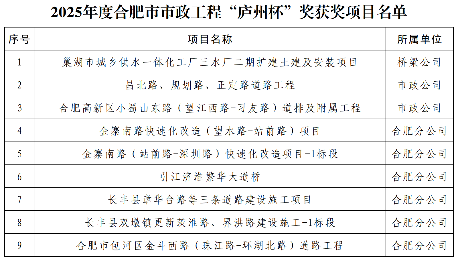 近日,合肥市市政工程協(xié)會公布了2025年度合肥市市政工程“廬州杯”獎獲獎項目名單,公司承建的9個項目榮譽登榜。