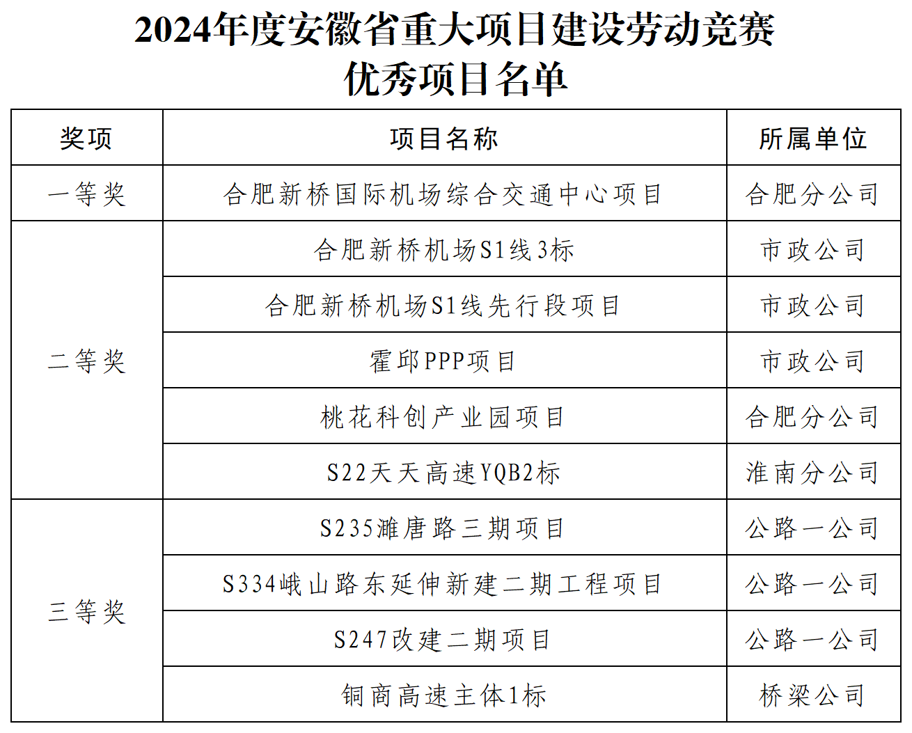 近日,安徽省住建廳與省總工會對2024年度重大項目建設勞動競賽參賽項目進行了通報表揚,公司承建的合肥新橋國際機場綜合交通中心項目、S1線3標等10個項目榮獲優(yōu)秀項目稱號。