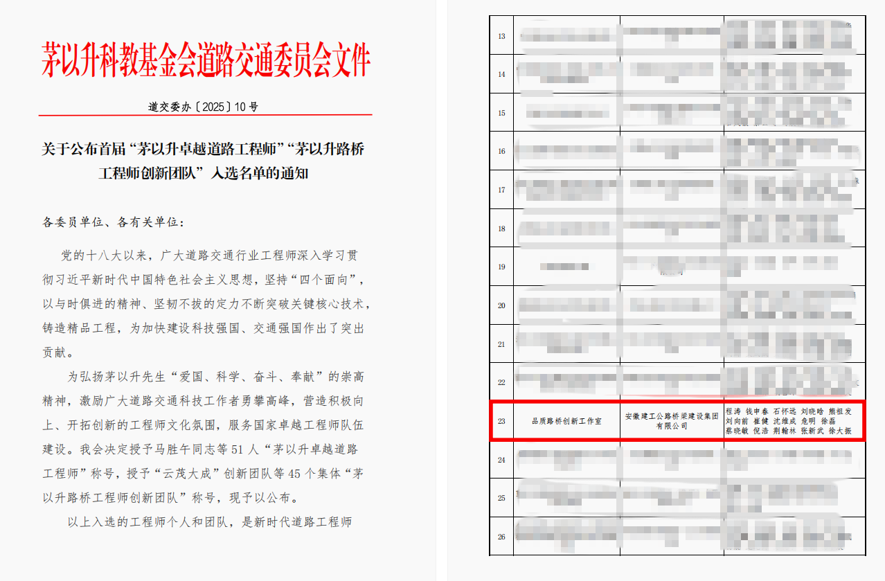 近日,茅以升科技教育基金會道路交通委員會公布首屆“茅以升路橋工程師創(chuàng)新團(tuán)隊(duì)”評選結(jié)果,公司“品質(zhì)路橋創(chuàng)新工作室”憑借扎實(shí)的技術(shù)攻關(guān)能力與突出的工程實(shí)踐成果成功入選。