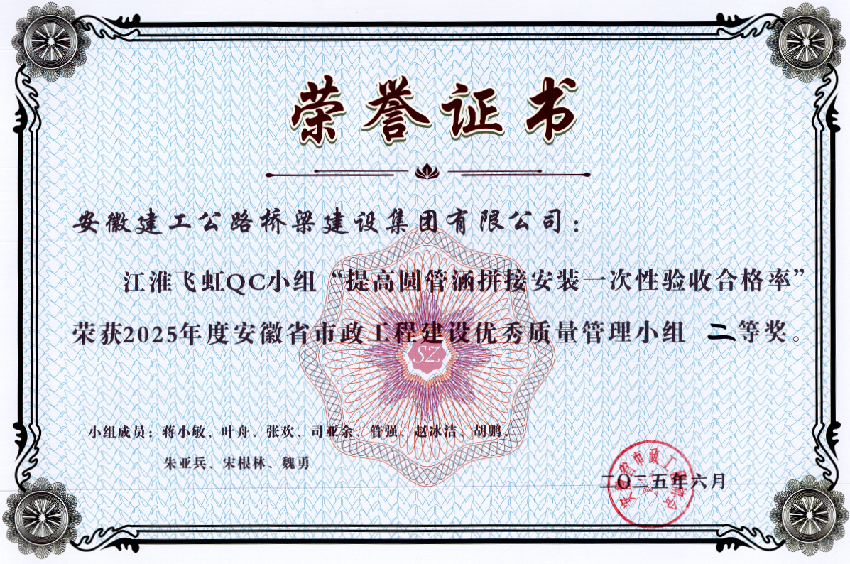 針對圓管涵等小結構物外觀質量通病,項目部成立“江淮飛虹”QC小組,聚焦混凝土質量、模板工藝、振搗操作及養(yǎng)護管理等環(huán)節(jié)展開技術攻關。其課題《提高圓管涵拼接安裝一次性驗收合格率》顯著提升了施工進度與實體質量,一次性驗收通過省去了整改、復檢時間,確保圓管涵施工按計劃銜接后續(xù)工序,助力項目率先完成全線40道圓管涵施工;合格的拼接安裝減少了后期漏水、沉降、結構開裂等隱患,提升了工程耐久性和質量穩(wěn)定性。該成果有效降低了成本損耗、保障了工期推進,榮獲2025年度安徽省工程建設質量與安全協(xié)會QC活動一等獎及安徽省市政工程建設優(yōu)秀質量管理小組二等獎。