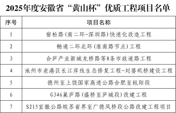 作為安徽省建設工程質量的最高榮譽獎項,“黃山杯”是全省工程建設領域質量標準的標桿,代表著行業頂尖水平與權威認可。此次獲獎的7個項目既有服務區域經濟發展的交通大動脈,也有關乎民生福祉的市政基礎設施,不僅在工程質量、技術創新、綠色建造等方面表現突出,更在服務民生、推動區域發展中發揮了重要作用。