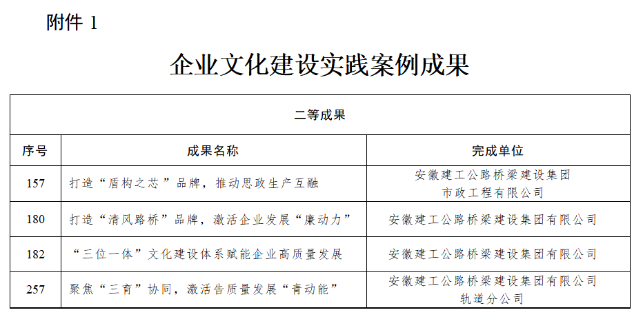 近日,中國施工企業(yè)管理協(xié)會發(fā)布2025年企業(yè)文化建設(shè)實踐案例成果,公司選送的案例《打造“盾構(gòu)之芯”品牌,推動思政生產(chǎn)互融”》《打造“清風路橋”品牌,激活企業(yè)發(fā)展“廉動力”》《“三位一體”文化建設(shè)體系賦能企業(yè)高質(zhì)量發(fā)展》《聚焦“三育”協(xié)同,激活高質(zhì)量發(fā)展“青動能”》,從全國1000余個參評案例中脫穎而出,成功入選企業(yè)文化建設(shè)實踐案例二等成果,充分展現(xiàn)了公司多年來在企業(yè)文化建設(shè)方面的累累碩果。