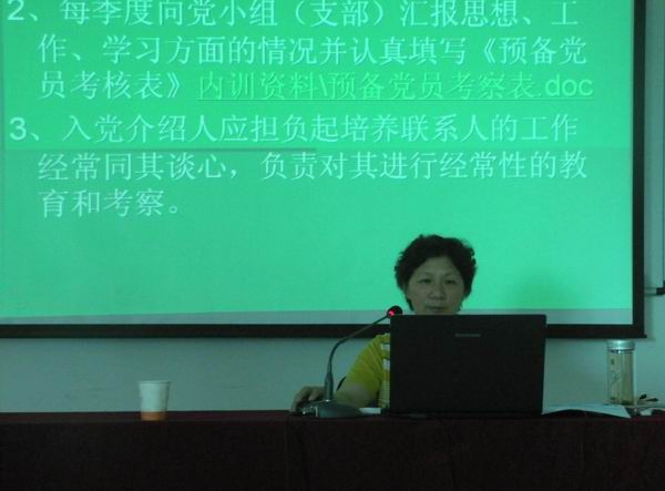 黨委辦公室主任劉昀主持了培訓(xùn)會(huì),并就發(fā)展黨員工作程序,作了專(zhuān)題講座。劉主任通過(guò)PPT課件,系統(tǒng)的介紹了黨員發(fā)展程序,從制訂發(fā)展黨員的工作計(jì)劃開(kāi)始,到預(yù)備黨員轉(zhuǎn)正、整個(gè)入黨材料存入個(gè)人檔案,以及最后的責(zé)任追究都作了詳細(xì)介紹,讓與會(huì)人員對(duì)發(fā)展黨員工作的程序有了清楚的了解。隨后,大家一起觀看了《欲之害——段義和腐敗案件警示錄》。專(zhuān)題片揭露了段義和利用職務(wù)便利大肆索賄的腐敗行徑,深刻揭示了腐化墮落的思想根源和蛻變軌跡。通過(guò)觀看警示教育片,使大家接受了一次深刻的思想教育和精神洗禮,進(jìn)一步認(rèn)識(shí)了在新形式下反腐倡廉建設(shè)的重要性。