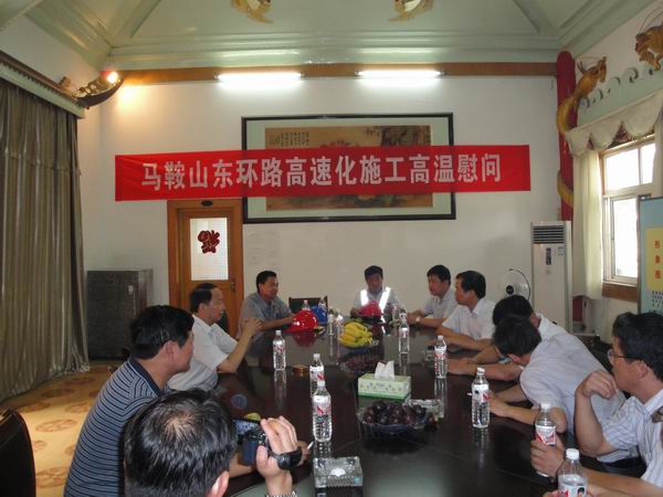 在我項目部大廳,王書記首先發(fā)表了熱情洋溢的講話,高度贊揚了我項目勇戰(zhàn)高溫、搶抓工期、誓保質(zhì)量的大無畏施工精神。隨后,王書記又送上了慰問信,并與員工代表們一一握手,發(fā)放慰問金、慰問品。最后,在項目部會議室,王書記一行與蘇指揮長,蔡主任、江主任,總監(jiān)代表郭亮以及我部項目經(jīng)理冷峰等進行座談,詳細了解了我南環(huán)02標(biāo)項目的整體情況以及近期施工的進展情況,希望我部繼續(xù)發(fā)揚安徽省路橋公司攻堅克難的優(yōu)良傳統(tǒng),保質(zhì)保量的如期完成東環(huán)02標(biāo)項目建設(shè)任務(wù)。